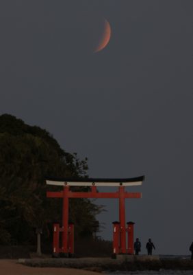 2021/11/20県内一般ニュース月が地球の影に入り、欠けたように見える「部分月食」が19日、県内各地で観測された。今回は月の大部分が影に隠れるため極めて「皆既月食」に近い状態が長時間続き、赤みを帯びた月が夜空に輝いていた。 宮崎市の青島では、青島神社参道の上に欠...