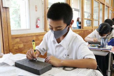 2021/09/16地域の話題世界に一つだけの作品―。串間市・串間中(平田史士校長、383人)の1年制119人は10日、同市の道の駅「くしま」内で使用する記念レンガを制作した。文字や絵などを彫り、オリジナルの作品作りに挑戦した。 焼きを入れる前の縦10センチ、...