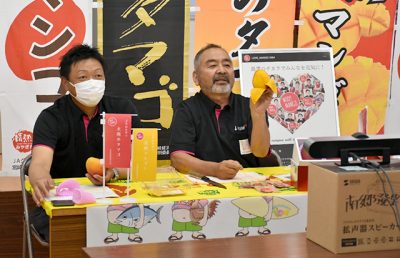 2021/06/18地域の話題日南市南郷町特産の完熟マンゴーについて知ってもらおうと、JAはまゆう果樹部会亜熱帯果樹専門部(河野俊昭会長)は12日、京都の小学生を対象にしたビデオ会議システムを使ったPRイベントを行った。 青果卸売業の京都青果合同(京都市)と実...