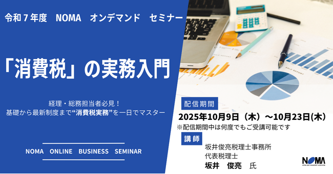 一般社団法人日本経営協会(NOMA)不安な箇所を繰り返し視聴 講師に質問もできる実務直結講座 一般社団法人日本経営協会(本部事務局:東京都渋谷区、会長:高原 豪久)は、2025年7月に開催し多くの参加者から好評をいただいた「消費税の実務入...