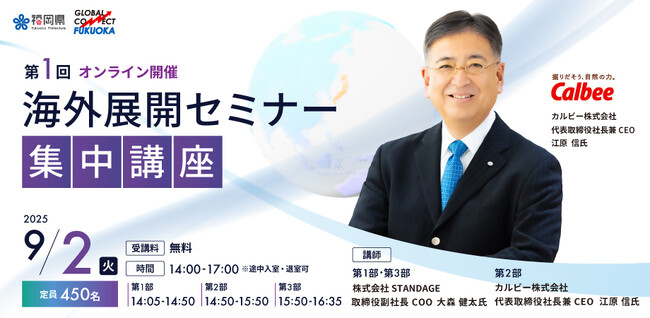 福岡県ベンチャービジネス支援協議会 海外展開セミナーの集中講座では、グローバルな海外展開に成功している企業の経営者等から成功・失敗を含むリアルな実体験をお話いただくとともに、マーケット情報や輸出にかかる法規制などの講座を複数回開講し、海外...