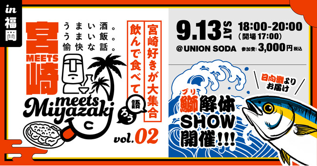 宮崎県宮崎好きの若者大歓迎! 福岡県にお住まいの20~30代を対象とする宮崎好きの方々の親睦を深めるイベントを開催します。 宮崎ならではの料理やお酒を準備して、皆様のご参加をお待ちしております。 当日は、宮崎県産ブリの解体ショーを...