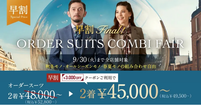 グローバルスタイル全店舗対象!その場で使える《3,000円OFF》早割クーポンプレゼント! オーダースーツ専門店「グローバルスタイル」を運営するグローバルスタイル株式会社(東京証券取引所 スタンダード市場:7126、本社:大阪市中央区、...