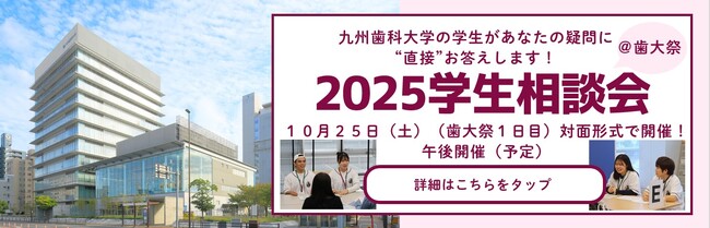 九州歯科大学九州歯科大学の学生が高校生・受験生からの相談に対面形式で対応 公立大学法人 九州歯科大学(キャンパス:福岡県北九州市、理事長・学長:粟野 秀慈)では、本学をより詳しく知って身近に感じてもらうことを目的として開催している「WEB...