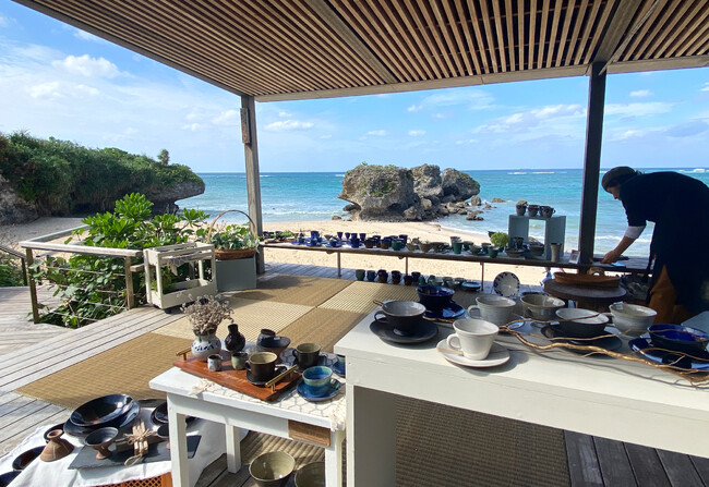 星野リゾート~毎日楽しめるユニークな展示と、工房が週替わりで出店する土日の直売会。今年は沖縄伝統の酒器「ゆしびん」で味わうティーセットが新たに登場~ 土日に開催される工房の直売会。海辺のテラスや大屋根デッキに器が並ぶ 圧倒的な絶景とスケー...