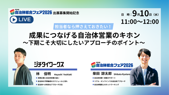 一般社団法人日本経営協会(NOMA)下期営業戦略・入札対策に役立つ“実践ノウハウ”もご紹介 一般社団法人日本経営協会(本部事務局:東京都渋谷区、会長:高原 豪久)は、”公民連携”をテーマとした総合展示会「自治体総合フェア2026」の出展募...