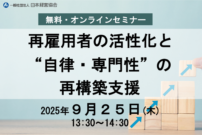 一般社団法人日本経営協会(NOMA)再雇用を成功に導き、組織を活性化する実践ポイントを紹介 一般社団法人日本経営協会(本部事務局:東京都渋谷区、会長:高原 豪久)は、企業の人事・研修・経営企画ご担当者様を対象に、無料オンラインセミナー「再...