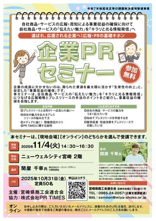 宮崎県商工会連合会~株式会社PR TIMESとタイアップし、情報発信力の強化を支援~ 宮崎県商工会連合会は、中小企業・小規模事業者の広報力・情報発信力の向上を目的として、株式会社PR TIMESとタイアップし、広報・PRの基本が学べるセミ...