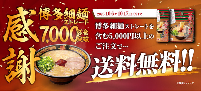 株式会社一蘭「一蘭ラーメン 博多細麺ストレート」が7,000万食を突破したことを記念し、期間限定で送料無料企画を実施いたします。 株式会社一蘭は、「一蘭ラーメン 博多細麺ストレート」の累計出荷数が7,000万食を突破したことを記念し、『「...