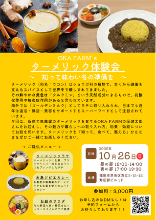 株式会社sumire~ 知って味わい冬の準備を ~ 秋の冷えと“なんとなく不調”に。 糸島の無農薬ターメリックで整う、食と学びの体験会を開催します。 朝晩が冷えるようになり、なんだか調子が出ない。 肌が荒れたり、お腹が張ったり、気分も落ち...