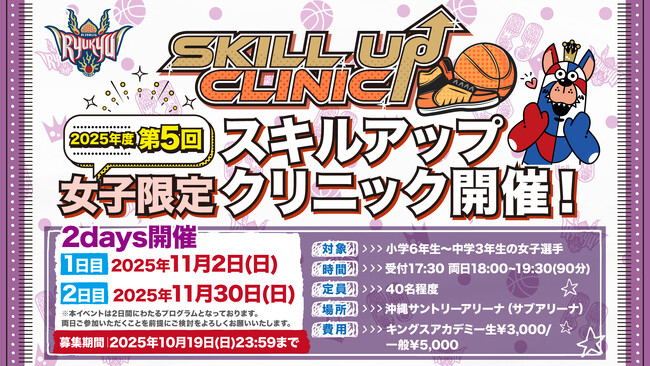琉球ゴールデンキングス この度、琉球ゴールデンキングスアカデミーでは「女子限定スキルアップクリニック」11月2日(日)と30日(日)の2日間に渡り、開催いたします。 本クリニックは、小学6年生~中学3年生の女子選手を対象に、キングス...
