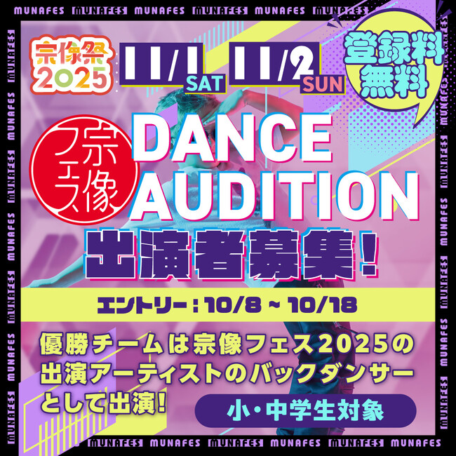 インプレッション株式会社 宗像フェスは「常に子どもたちの夢を創る」を大きな目的の1つとして、今年はアーティストと一緒のステージで輝く子どもたちの笑顔を見たいと考え、イベント当日にダンスオーディションイベントを開催します。 宗像フェスは「子...