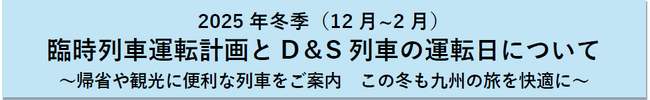 九州旅客鉄道株式会社 JR 九州では、お客さまのご利用が多く見込まれる冬季期間(12 月~2 月)に臨時列車(新幹線・ 特急列車)を合計806 本運転します。また特別な旅を彩るD&S 列車の運転日も決定しました。 人気の観光地やイベントへ...