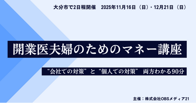 株式会社OBSメディア21株式会社OBSメディア21(本社:大分市新栄町)は、大分県でクリニックなどを経営される開業医ご夫婦を対象に、「開業医夫婦のためのマネー講座」を2025年11月・12月に大分市で開催します。 本講座では、法人...