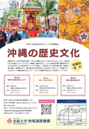 一般財団法人 沖縄美ら島財団 沖縄美ら島財団では、令和7年度名桜大学公開講座(シリーズ講座)において、「沖縄の歴史文化」「沖縄の動物」「沖縄の植物」「沖縄の博物館」の4つのカテゴリーで、研究者による分かりやすい解説を実施いたします。 一般...