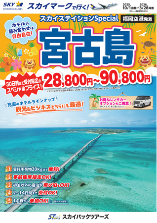 スカイパックツアーズ株式会社スカイマーク航空券とホテルがセットになった格安パッケージプラン『スカイステイションSpecial 宮古島』を販売開始!人気ホテルのラインナップが充実♪早めのご予約がお得です! スカイパックツアーズ株式会社(本社...