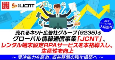 【端末キッティング能力大幅強化】売れるネット広告社グループ(9235)、グローバル情報通信事業「JCNT」がレンタル端末設定RPAサービスを本格導入し、生産性を向上