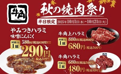 【牛角】秋の“ハラミ”祭り到来!やみつきハラミ「半額」で食欲の秋を加速!~人気3種が一斉割引、お得にハラミ三昧~