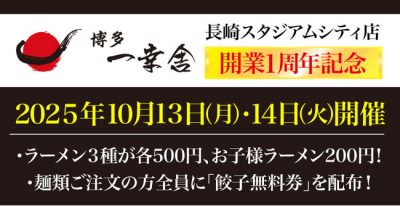 【元祖泡系博多一幸舎】 長崎スタジアムシティ店が開業1周年!2025年10月13日(月)・14日(火)の2日間は数量限定「ラーメン」1杯を特別価格の500円でご提供いたします!