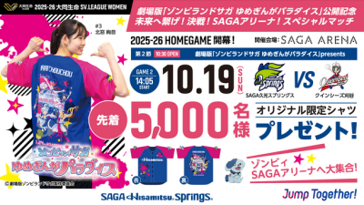 2025/10/06サンプルSAGA久光スプリングス株式会社10月19日は劇場版『ゾンビランドサガ ゆめぎんがパラダイス』とのコラボ満載のSAGAアリーナに 10月19日(日)に開催をするSAGAアリーナHOME開幕戦GAME2は 「劇場版ゾンビランドサガ ゆめぎん...