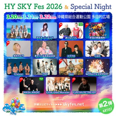 2025/10/04サンプル株式会社grabss「HY SKY Fes 2026 & Special Night」が2026年3月20日(金・祝)、21日(土)、22日(日)に沖縄県総合運動公園 多目的広場(沖縄県沖縄市比屋根5-3-1)にて開催されます。そし...