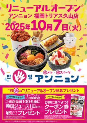 10月7日(火)リニューアル・オープン! 韓メシ・韓スイーツ「 アンニョン」福岡トリアス久山店(1999年オープンの1号店)
